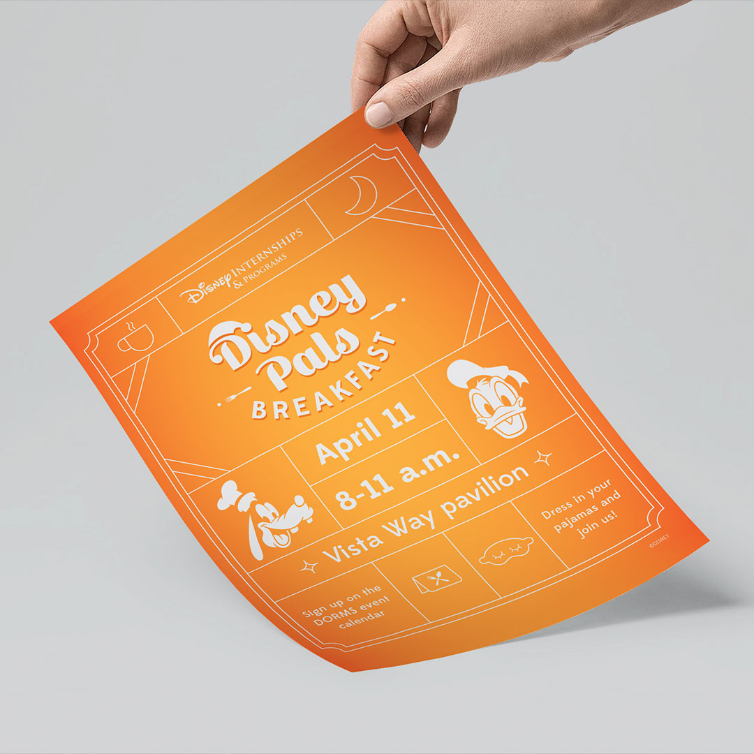 The event was a pajamas breakfast party with Goofy and Donald. The look and feel of the poster design was simple and invitation-like. The orange gradient background symbolized sunrise and breakfast-time. Apart from the poster, I also created various signages for the event.