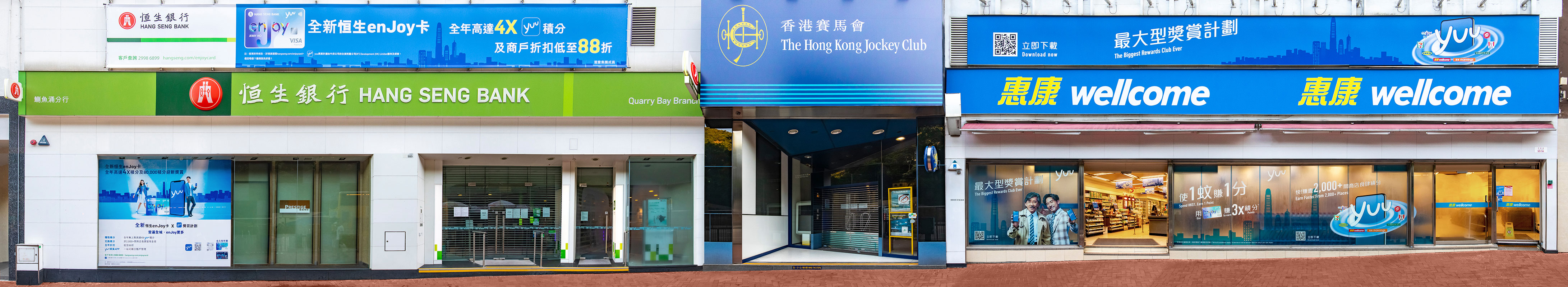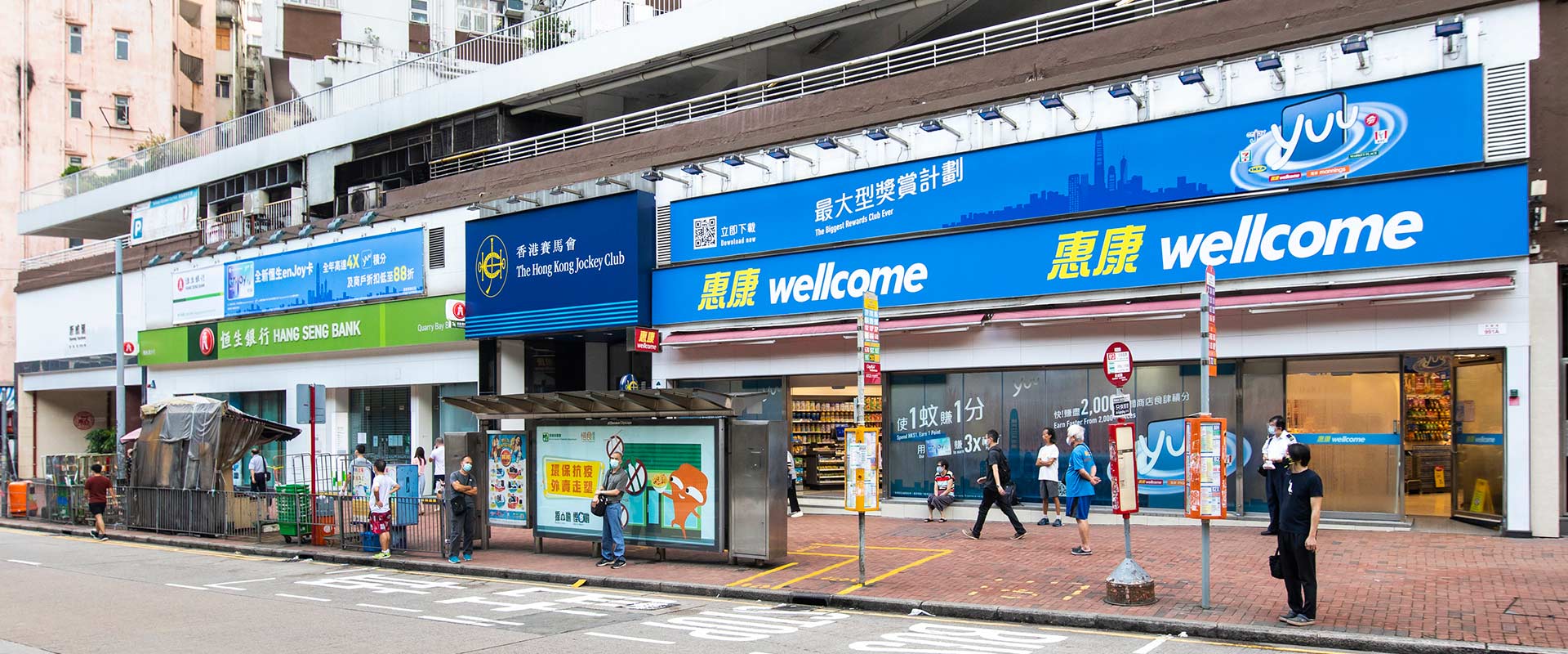 After the launch of the campaign, the client made a challenging request. It was to have a perfect straight-on photo of the Hang Seng Bank and Wellcome in Quarry Bay, in order to showcase the partnership between the bank and the rewards club. However, the retail stores were located on a busy street filled with newspaper stands, street lamps, bus stops and pedestrians. The task sounded almost impossible, but challenge accepted.