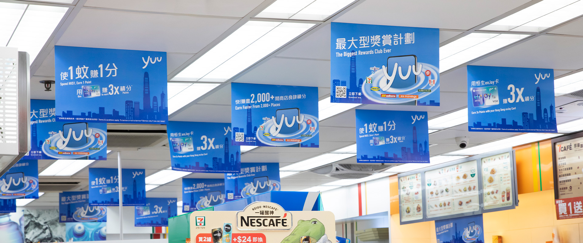 yuu Rewards is the biggest rewards club ever in Hong Kong. By downloading the app, people will be able to join the rewards club for free. The app allows yuu member to earn Points by shopping and dinning in over 2,000 places across the city, such as Wellcome, Mannings, 7-Eleven, IKEA, KFC, Pizza Hut, Market Place, and more. yuu Rewards offers more than just a digital experience. It also teams up with Hang Seng Bank to roll out a new Hang Seng yuu enJoy credit card. As part of the creative team in Tag, I was in charge of designing the key visual and POSM (Point of Sale Materials) materials for yuu Rewards.